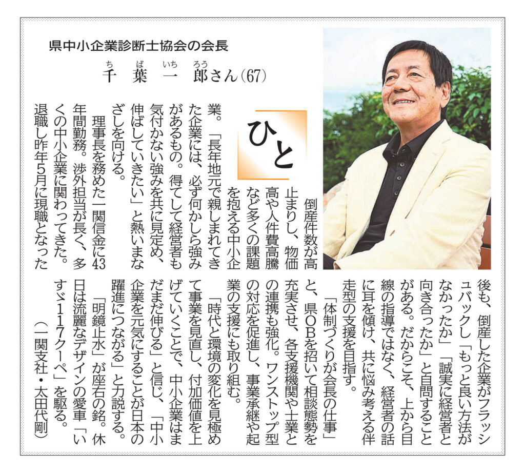 当協会 千葉一郎会長の記事が岩手日報に掲載されました。~「ひと」県中小企業診断士協会の会長 千葉一郎さん(67)~
